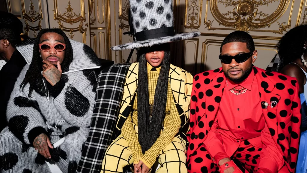 Usher, the renowned singer who was in town for a series of sold-out concerts, made a surprise appearance at Marni. He took the fashion world by storm with his bold fashion choices, including a striking red and black polka dot ensemble that turned heads and left onlookers stunned. At Chanel, Usher continued to mesmerize as he was spotted wearing a bespoke tweed and pearl blazer, accessorized with strands of naval-grazing pearls. He was in esteemed company, with Riley Keough, recently announced as Chanel’s newest ambassador, and Jennie Kim of Blackpink among the other notable guests.