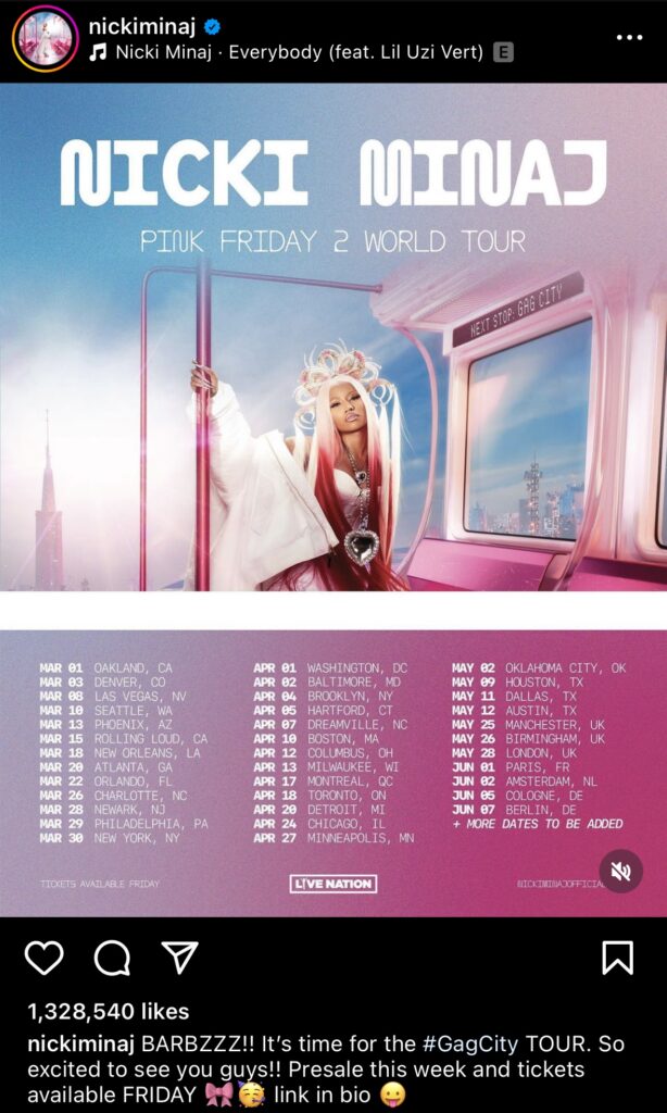 Taking to Instagram on Monday (Dec. 11), Nicki Minaj shared the thrilling news with her followers. “BARBZZZ!! It’s time for the #GagCity TOUR. So excited to see you guys!! Presale this week and tickets available FRIDAY 🎀🥳,” she exclaimed. The tour is expected to span three months, featuring electrifying performances in arenas across the United States and Europe.
